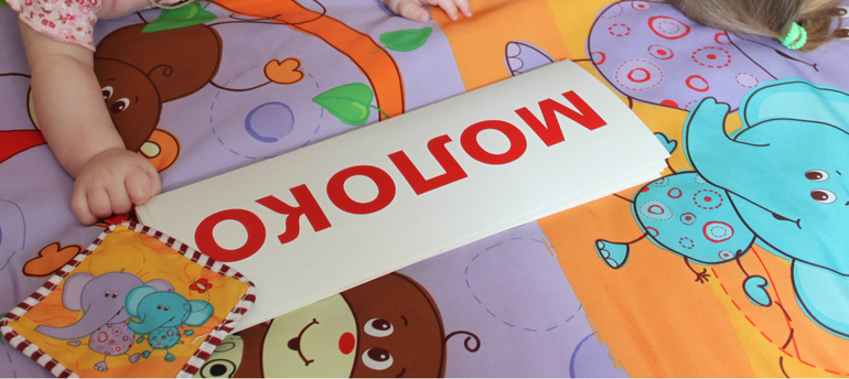 3) Лежит на животике, например, на коврике, показываю слова, находясь сбоку от неё или лежа рядышком на животе или сидя сидя рядом;