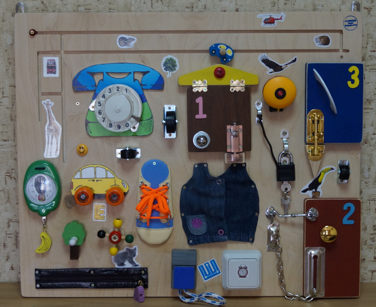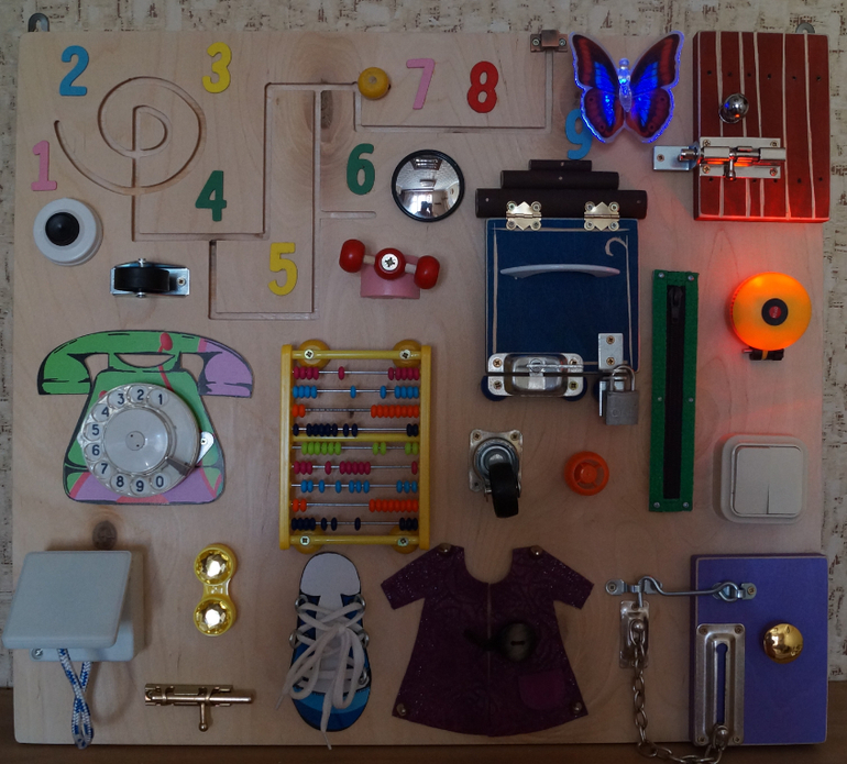 Отличные у вас получаются досочки! Я тоже мужа попросила сделать бизиборд для сына. Одна досочка готова, собираем идеи на вторую. Подскажите, а где вы покупали элемент "кроссовок"? Одежду — шили сами из ткани? А каким инструментом выпиливали лабиринты?Заранее благодарю за ответ.