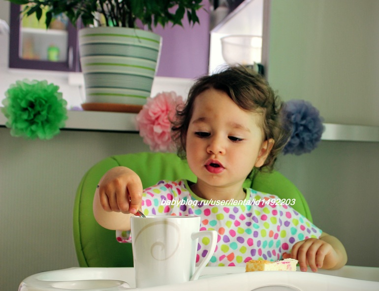 На завтрак мы накормили ребенка кашей, а потом тортом, который мы приобрели накануне в одной изумительной пекарне недалеко от моего университета... Но вот только зажженной свечки она безумно испугалась и пустилась в слезы. Здесь она уже более менее успокоилась и решила вкусить то, что для нее приготовили =))