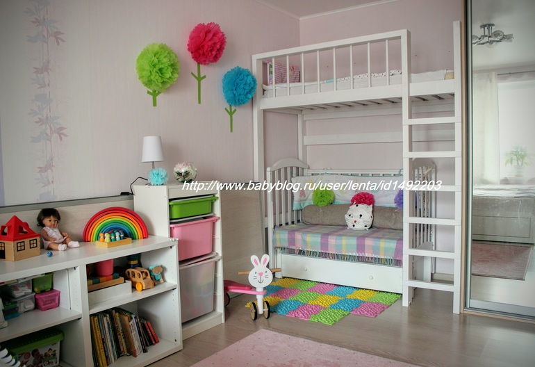 Вдоль стены стоят ее игрушки и часть книг, по другой стороне имеется маленький столик, который переехал из другой комнаты и шкафчики для одежды. Но из-за того, что мы еще не все разложили как планируется, фото пока не показываю =) В другую же комнату переехал ее круглый стол и почти все творческие принадлежности. Чтобы в будущем она с сестричкой могла реализовывать свой творческий порыв в свободной от ковров комнате =)) Хотя, кто знает как может вновь измениться мое представление о их детском уголке спустя годик-другой =))