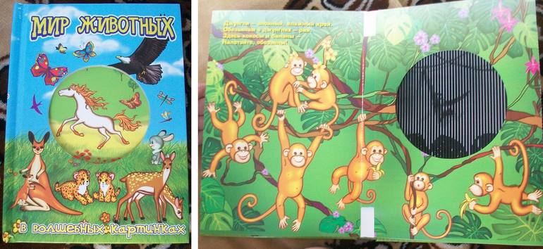 - Книга "Мир животных" - со зрительными эффектами: если поворачиваешь страничку из стороны в сторону, животное на картинке начинает двигаться: лошадка "скачет", обезьяна "прыгает" с ветки на ветку и др.