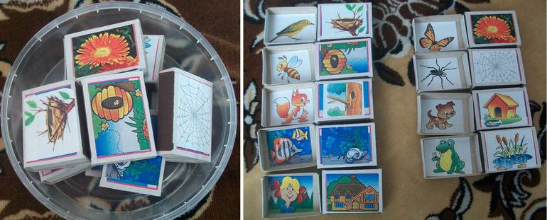 8. Сделала игру «Кто где живет» с использованием спичечных коробок. Сначала вытаскиваем всех жильцов из домиков, перемешиваем и подбираем каждому свой домик.