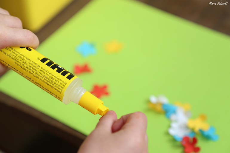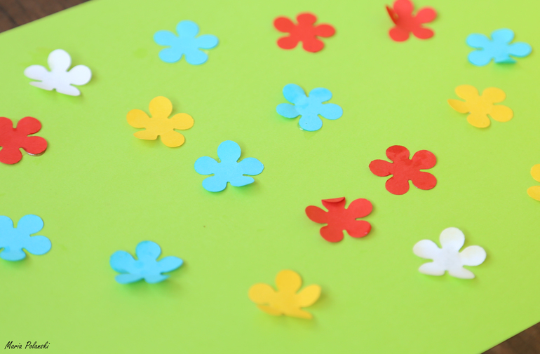 Как-то раз дождливым днем мы клеили жизнерадостную аппликацию. Цветы я за 5 минут нарезала фигурным дыроколом, а все остальное работа Вари: сама мазала жидким клеем, сама приклеивала и кстати очень равномерно! Я не подсказывала. Меня честно сказать, вообще рядом в основном не было)))