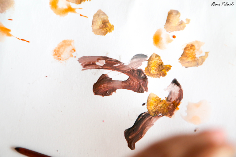 А это уже пошли эксперименты со способом нанесения краски. Большую ненужную тряпку (а то и тазик) лучше взять заранее, чтобы не отвлекаться от радости творчества. Когда воды становилось слишком много, я просто промокала ее тряпкой и мы продолжали.