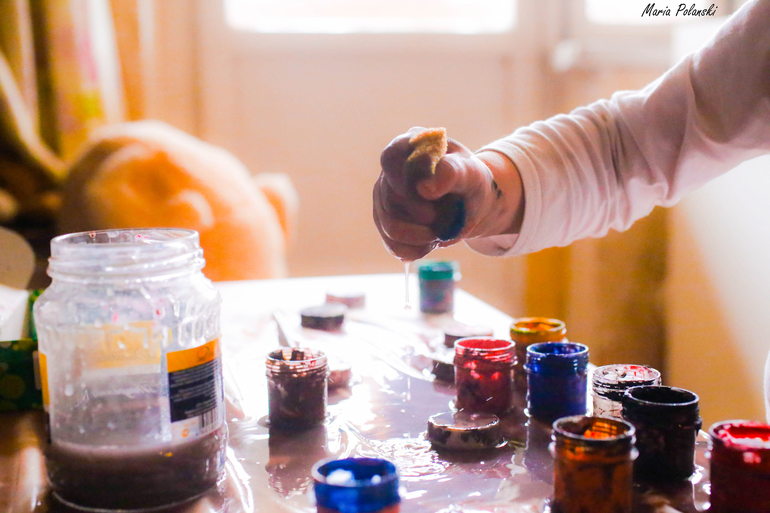После прочтения разнообразных книг по свободе творчества и самовыражения, о которых я писала вот тут, я дала Варе краски и эту самую свободу. Нет, конечно истина как обычно по середине. Если просто дать краски, кисти и сказать рисуй, двухлетний ребенок не начнет творить шедевры. Но и рука в руке рисовать тридцатое по счету солнышко тоже не вариант. Поэтому я решила придерживаться середины: я показываю КАК рисовать, а не ЧТО. Как можно поставить пятно, как можно нарисовать круг или линию, как можно брызгать краской и смешивать их на листе, что будет если рисовать не кистью, а пальцем, а если губкой? Мы ставим эксперименты с материалами и цветами, мы рисуем не ради того, чтобы что-то изобразить (т.е. результата), а ради самого удовольствия от процесса.
