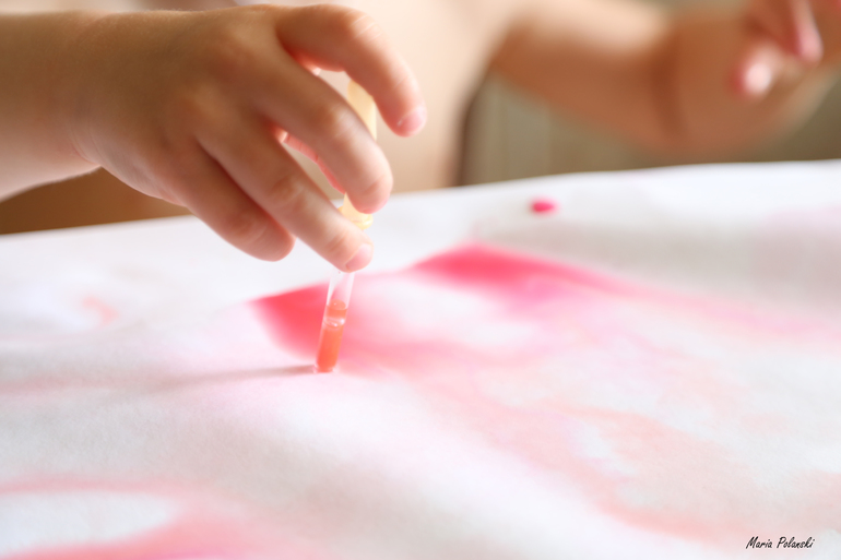 Рисование пипеткой и жидкой акварелью. Занятие два в одном: и мелкую моторику развивает и творчество. Мы рисовали в технике "мокрым по мокрому", т.е. по предварительно сможенному водой листу бумаги. И у нас должны были получиться красивые кляксы, но видимо воды многовато налили и у нас получилось красивое закатное небо с разными оттенками багряного, пурпурного, алого и кирпичного.