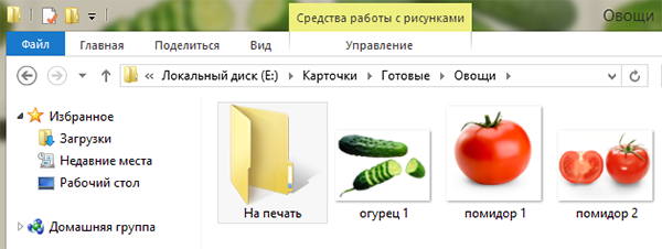 Допустим я работаю над темой "Овощи". Составила в таблице список и начала подбирать изображения. Сначала я скачиваю их в папку "В работе", обрабатываю их, делаю из них карточки и сохраняю туда же. Когда я закончила тему, исходники переношу в папку "Ресурс"-"Овощи", а готовые карточки в "Готовые"-"Овощи"-"На печать". Напечатанные карточки потом переносятся просто в "Готовые"-"Овощи".
