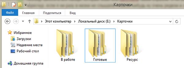 Таким образом я разделяю готовое и не готовое, напечатанное и нет, всегда имею возможность быстро найти необходимые карточки. Исходники я сохраняю, чтобы не искать их заново в интернете в случае, если они снова понадобятся, такое случается довольно часто.