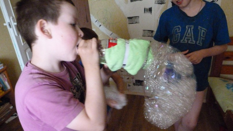 лучше брать пластиковую бутылку объёмом поменьше, а то сложно детям выдувать долго.