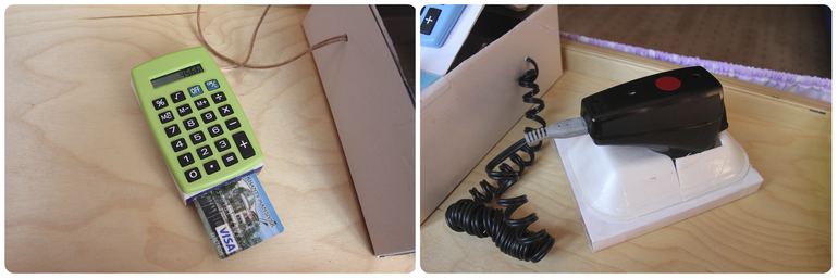 Еще один гаджет - терминал для карточек (на фото - слева, зелененький). А как же без него? В последнее время карточками пользуемся чаще чем реальными купюрами. Сверху калькулятор, внизу коробка из под таблеток. Сделала прорезь, внутри пенопласт (кусочек), чтоб карта не выпадала и полностью не пряталась.