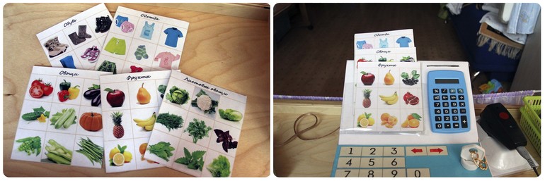 Карточки с картинками. На первое время сделала только овощи, фрукты и одежду. Что-то типа реальных весов в гипермаркетах (те на которых мы в овощных отделах взвешиваем продукты), у нас же чтоб интересней было, плюсом запоминаем группы (овощи, фрукты, обувь и т.п.).