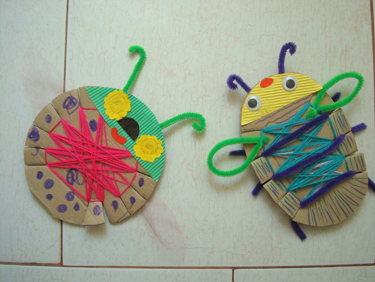 Это стыренная из инстаграма идея арт-жуков с элементами техники "изонить". Наматывали вместе, приклеивала детальки дочка (я подсказывала), разрисовывали совместно - Соня горошки, я полоски. Интересна сама идея с нитками, а так для нашего возраста мне показалось рановато (Соне 2г 3 мес), хотя все индивидуально.