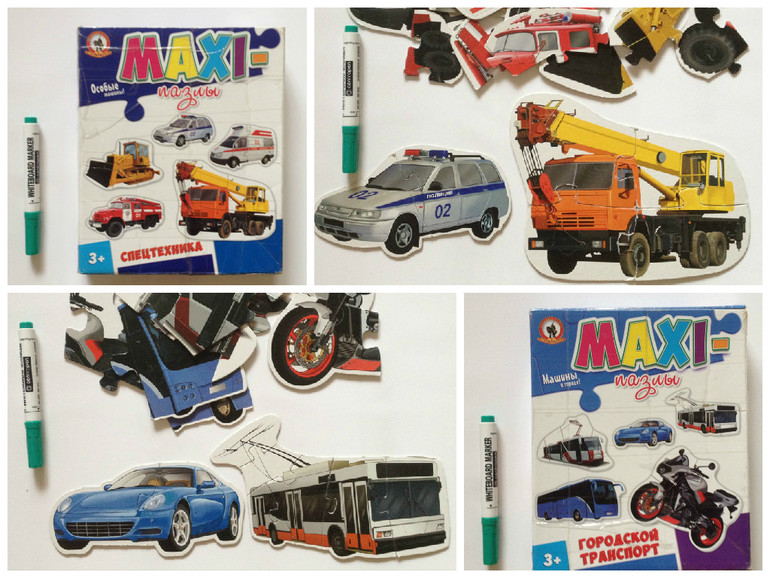 Макси-пазлы "Городской транспорт". 5 видов транспорта: мотоцикл, машина, автобус, троллейбус, трамвай. 1 пазл - 2 элемента, 2 пазл - 3 элемента, 3 пазл - 4 элемента, 4 пазл - 5 элемента, 5 пазл - 6 элементов.