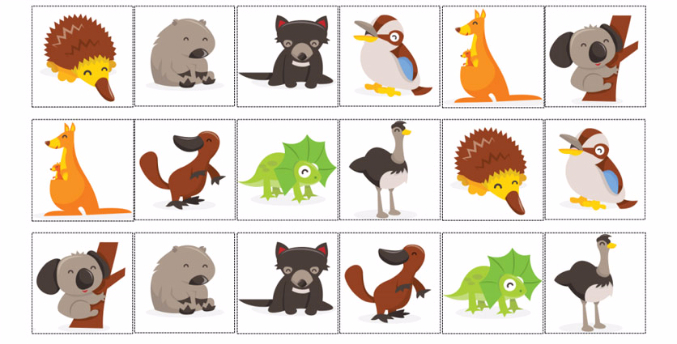 Распечатываем картинки австралийских животных( можно использовать приложение), выкладываем сначала 4-5 картинок перед малышом, даем время запомнить. Затем переворачиваем и предлагаем перевернуть сначала кенугру, затем коалу и т.д.