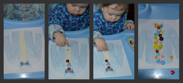 3. Моторика. Выкладывали пуговки на рубашку. Доче очень понравилось, возились минут 20, то приклеивали, то отрывали, то просто перебирали.За идею спасибо Евгении