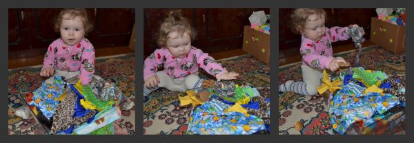 7. Поиграли с сенсорной коробочкой в которой была целая куча различных тканей в которой были спрятаны картонные пуговицы.