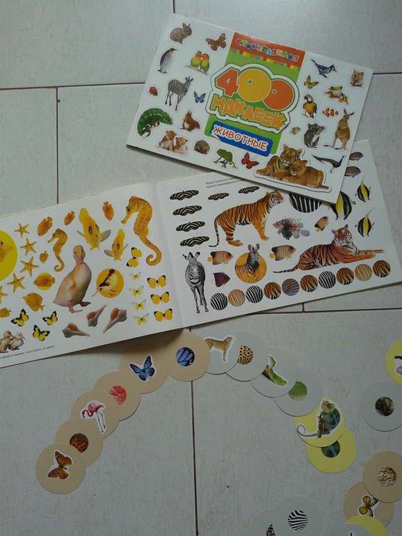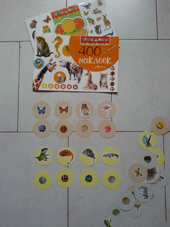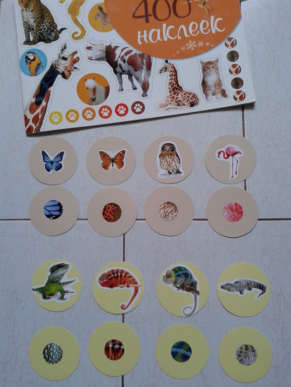 Ещё раз хочется сказать про наклейки, ну очень благодарный материал, сделала игру на определение похожести с помощью наклеек от Росмэн, наклеив их на цветной картон: