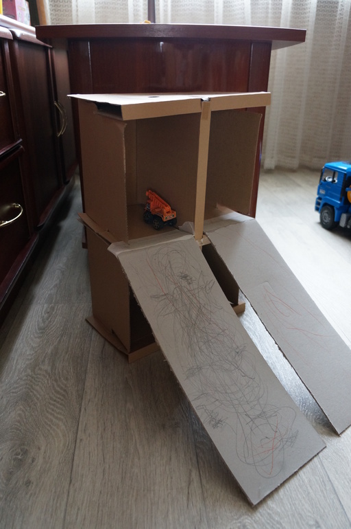 Знаю, что не очень эстетично получилось. Не хотелось заморачиваться. Просто пропадала упаковка от конструктора. Раскрашивал разумеется сам владелец и тем, что под руку ему попалось ))