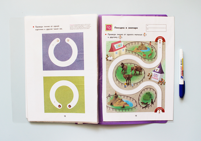 Рисуем обычным маркером на водной основе, он очень легко стирается влажной тряпочкой не оставляя следов. Задания можно совмещать, вставляя в одну папку странички сразу из несколько разных пособий.