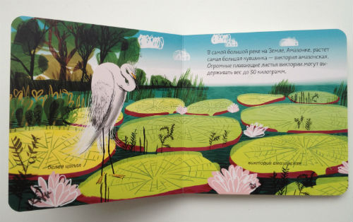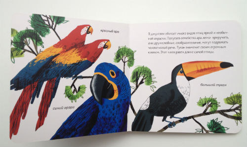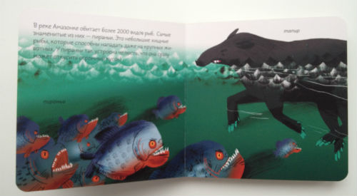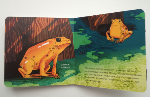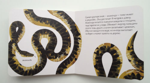Но сначала немного о книге, которая займет свое достойное место на дочкиной книжной полке. Немного потому, что проще показать, чем писать. Яркие, сочные иллюстрации перемежаются с энциклопедическим текстом. Плотный мелованный картон, беспроигрышная тематика о животных, присутствие новизны в материале (не кошки-собачки, которых в книгах будет много сейчас и в будущем), что может быть лучше для малыша?