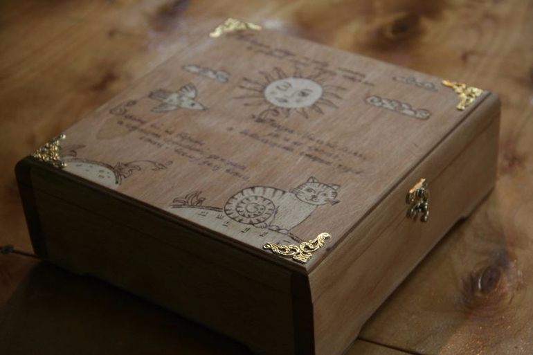 "Шкатулка со сказками - это целая книга сказок, рассказанная вашим ребенком и вами! Только успевайте записывать! Днем и перед сном, в дороге и дома. Чудо шкатулка в лубочном стиле, из натурального дерева, похожая на ларец с сокровищами. На "обложке" зачин к сказкам: "Не белые лебеди по небу летят, а добрые люди сказку говорят. Сказка быль не быль, да и не враньё, а бывальщина старых годов. Верьте ей не верьте, а слушать слушайте до конца: конец - всему делу венец." Начало есть! Открываем чудо-шкатулку - а там! Настоящая сказка! Цветная! Вот деревня с домами и лес с ёлками и грибами, ягодами. А еще озеро синее, по середине остров. На нем - дерево могучее, на дереве невероятная птица гнездо свила. Что за птица такая? Кто в деревне живёт? Вот и сад есть и огород. Козлик забрался на грядки с капустой. А если идти по дорожке можно прийти к морю! Там кораблик и берег песчаный с камушками и ракушками. А еще гора, а в горе пещера. В такой глубокой пещере непременно настоящие кристаллы растут!Добавляйте в шкатулку своих любимых героев и пусть ваша фантазия не знает границ! А когда выдумка закончится, можно нарисовать на бумаге новую сцену для сказки и в шкатулку вложить. Вот и будет новая книга сказок! Том второй! :)"