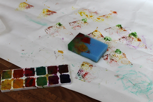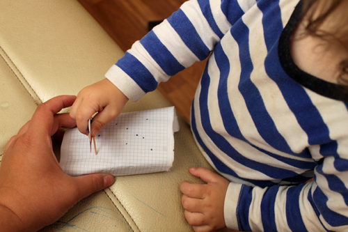 Ну пусть будет в этой категории наше новое развлечение:протыкание бумаги по точкам и по контурам зубочистками.Листок нужно положить на губку для мытья посуды: