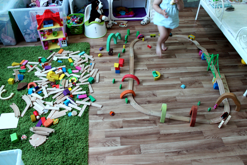 Еще одна любовь этого лета-деревянная дорога и тоннели.Играет сама очень долго,строит тоннели,что-то бормочет себе под нос и тд.