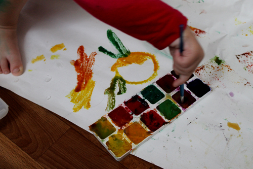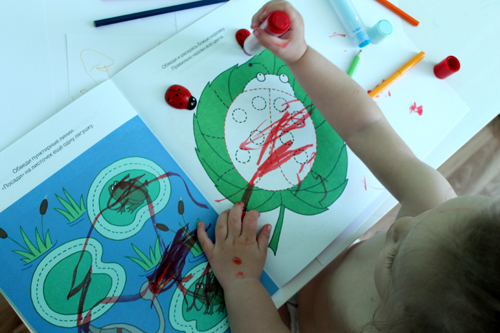 Кстати,фломастеры на фото-волшебные.Когда сверху закрашенной зоны проводишь белым,то они меняют цвет.Тоже любим ими развлекаться.