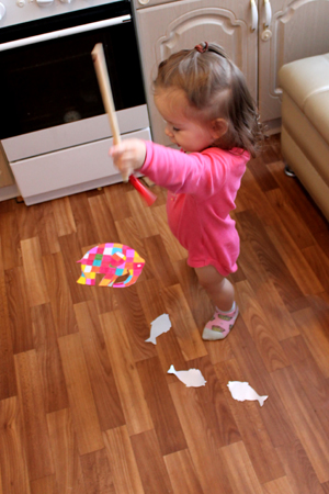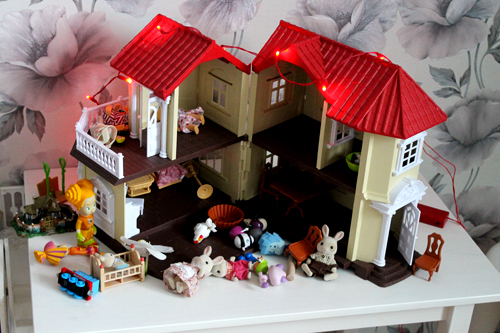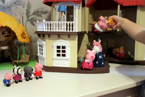Во-первых,она ужасно любит всякие домики и мелкие фигурки(человечки,животные и тд).Сама там что-то переставляет,стучит в дверь,человечки встречаются,целуются,идут куда-то вместе.Я показала один раз,наверное,дальше она сама.Как я уже рассказывала,водит их под кровать или в шкаф,и грозит им пальцем.
