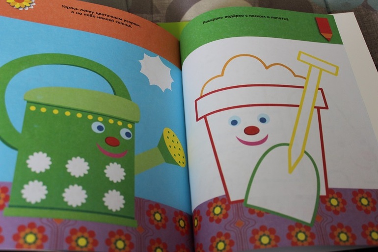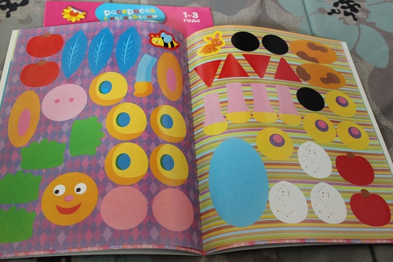 Моему бутузу-карапузу 2,5 уже, и он легко справляется с заданиями. Но для годовалых малышей книжки тоже подойдут - можно обсуждать картинки, калякать-малякать и учиться клеить наклейки. Изображения понятные, чуть схематичные, крупные и яркие.