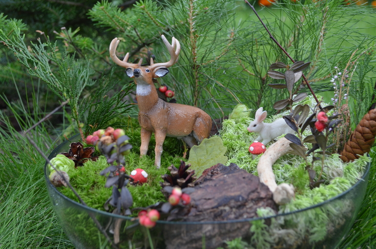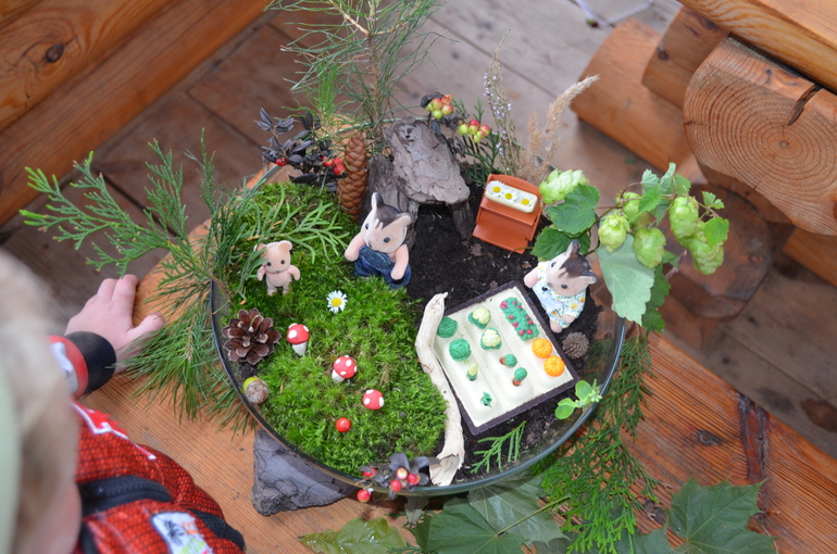 в таз насыпали чернозем, посадили елки, мох, разложили шишки, камушки, цветочки, грибочки и конечно зверей из нашего деревянного театра. получился очень богатый на события лес: то в гости колобок закатиться, то мужик рукавичку обронит, то красная шапочка к бабушке пойдет в гости.....