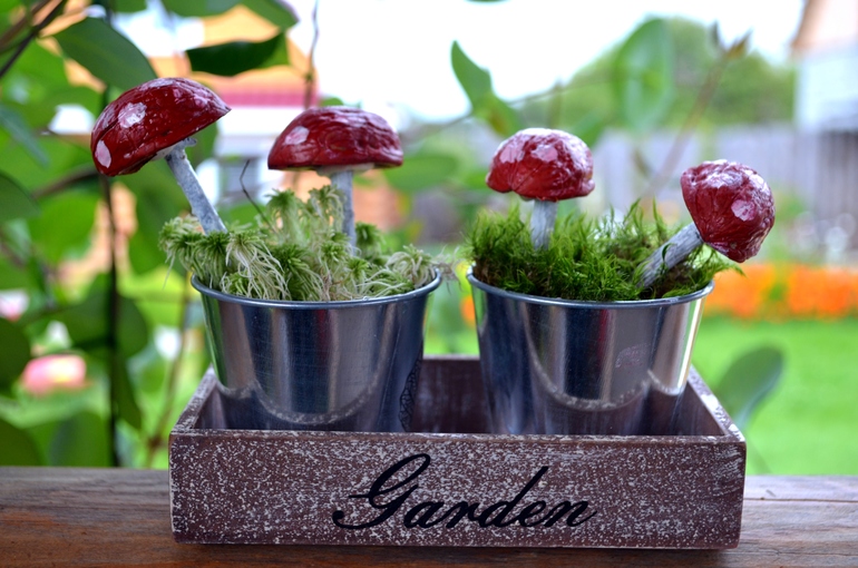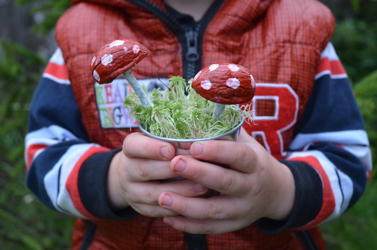 красили обычной акварельной краской. палочки в шляпку вставляли тоже при помощи пластилина. в горшочек предварительно насыпали земельку, а уж потом посадили мох с грибами.