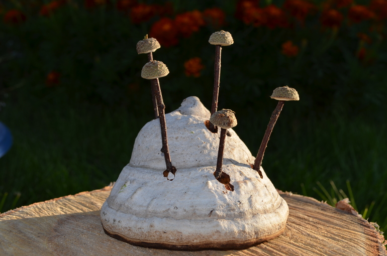 я убивала сразу нескольких зайцев: физическая нагрузка, за лето мы приучились свободно ходить на дальние расстояния (2-3 км) без нытья и только ногой, набирали природный материал, что обеспечивало нам прекрасное, разнообразное времяпрепровождения на вечер, изучали природу, много разговаривали, расширяя словарный запас.....ну ладно, вернемся к грибам. самыми пожалуй любимыми у нас были и остаются грибы из гипса. пакет алебастра весом 4кг (получилось 9 грибов), вода и все, ребенок занят часами, выводя новый вид (не все так безобидно, как на картинке, грибы у нас и красные, и синие, и зеленые, и пегие....)