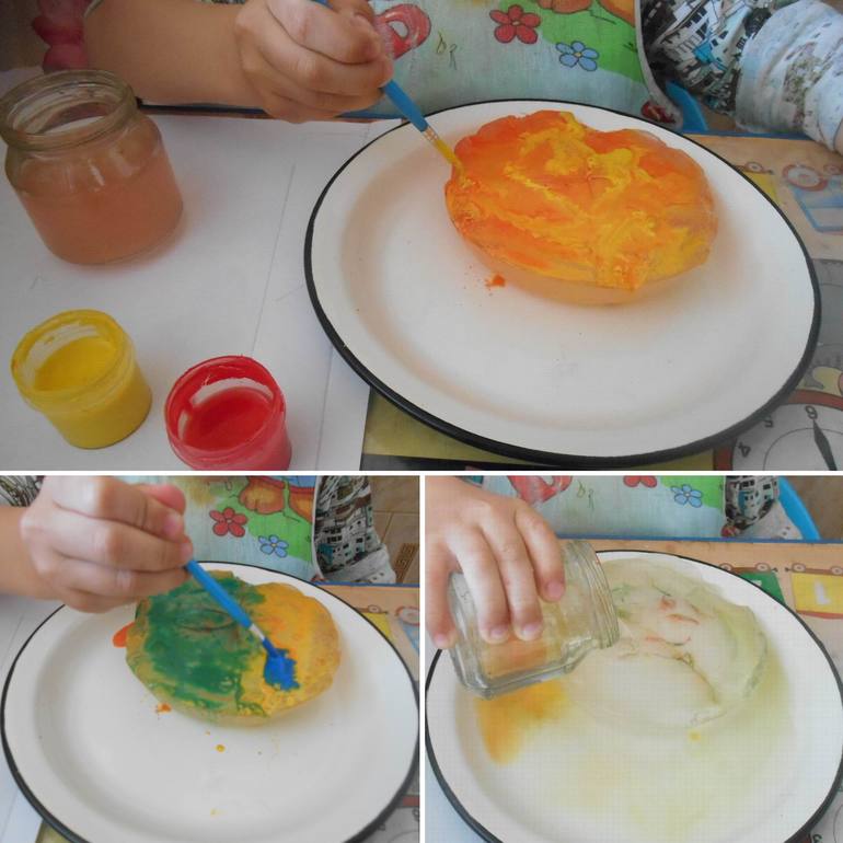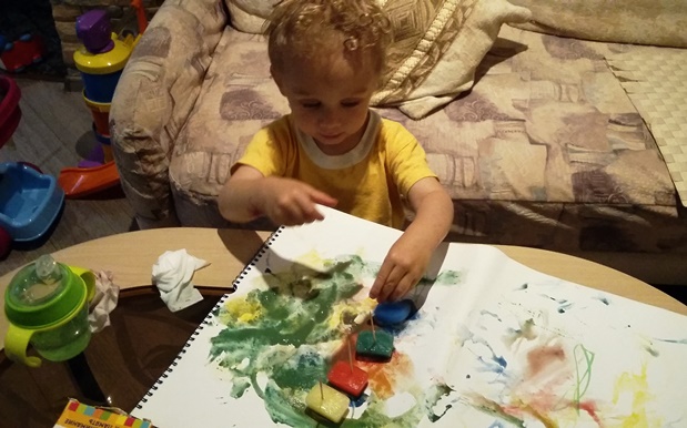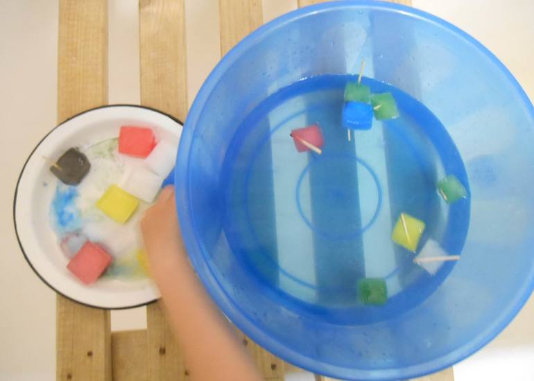 Играли впервые: достали краски и наблюдали их смешение и превращение из двух разных цветов в новый цвет. (Раньше так же смешивали воду разных цветов, переливая воду из разных баночек друг в друга.) А потом поливали лёд теплой водой и смотрели, как в середине растёт трещина. А т.к. лёд таял медленно, ускорили это дело уже в ванной в тазике.