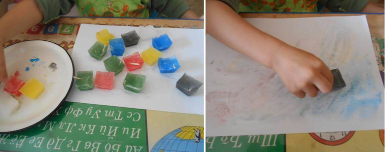 Гуашь+вода, залили по формочкам, выборочно положила спички, чтобы рукам было не холодно держать. Сначала мы пытались рисовать льдинками, но получалось совсем бледно (значит, мало гуаши). Я красила цветной льдинкой, а Максим поверх "закрашивал" всё черной льдинкой.
