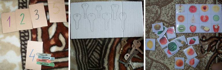 Глядя на цифру на карточке, нужно прицепить правильное количество прищепок. Карточки сделала по размерам, можно раскладывать по очереди как лесенку: всё выше и выше.