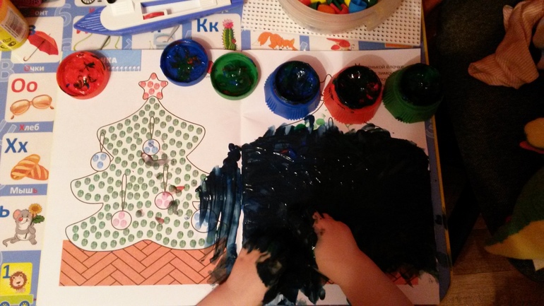 Мои художники в ванной рисуют. Там отмыть проще и художников и окружающую среду. Рисуют по настроению, могут правильно, а могут смешать все краски, потом свое творение прополоскать в ванной и гордо показать шедевр. Может это у вас елка темной ночью.
