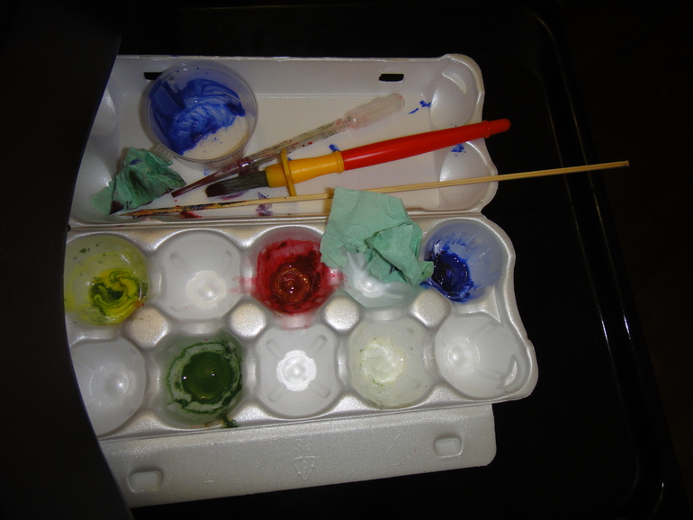 Краски развели с растворителем и тут первая ошибка, разводить надо в стеклянной посуде а мы в коробочке от яиц.