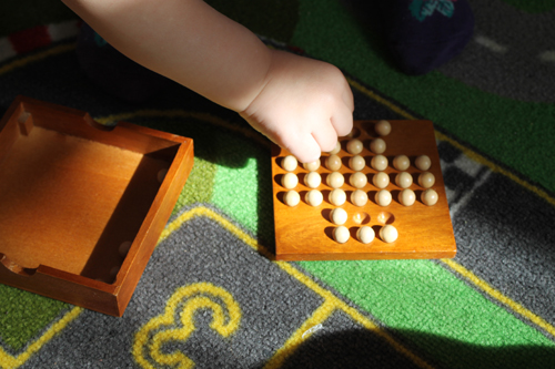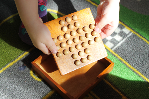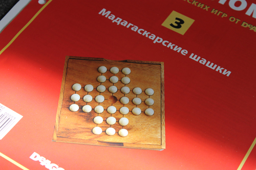 С третьим номером я обнаружила чудную игру "Мадагаскарские шашки".Игра сложная,конечно,для ребенка,но развивать моторику в самый раз.Мы раз 10 вставляли шарики в ячейки.Можно руками,можно пинцетом.Шарики закрываются в коробочку,так что хранить очень удобно.