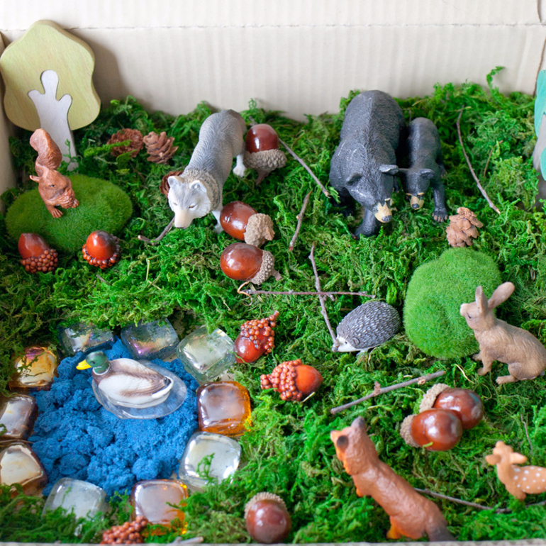 Изучаем окружающий мир (тематические занятия и циклы занятий)Эта неделя у нас началась с температуры у детей, потом меня тоже срубило, только сегодня мы все более менее в чувствах, сидим дома, все "бабье лето" пропустили:( Но не унываем и надеемся еще на теплые деньки...ну ладно, хотя бы бездождевые :) А пока вот коробочка для моих шустрят на быструю руку. Наполнитель искусственный мох, прудик - "живой" песок, желуди, шишки, орешки - фикспрайс, камушки из мха - алиэкспресс, животные shcleich, mojo, деревянные деревья-пазл покупала на ярмарке мастеров в магазине "из березки", вроде все :)