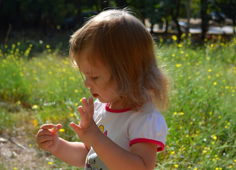 И природа вокруг удивляет своими чудесами! На одной полянке еще такое лето-лето, с зеленеющей травкой и ярко-желтыми полевыми цветами. Катюша нашла улиточку, изучает.