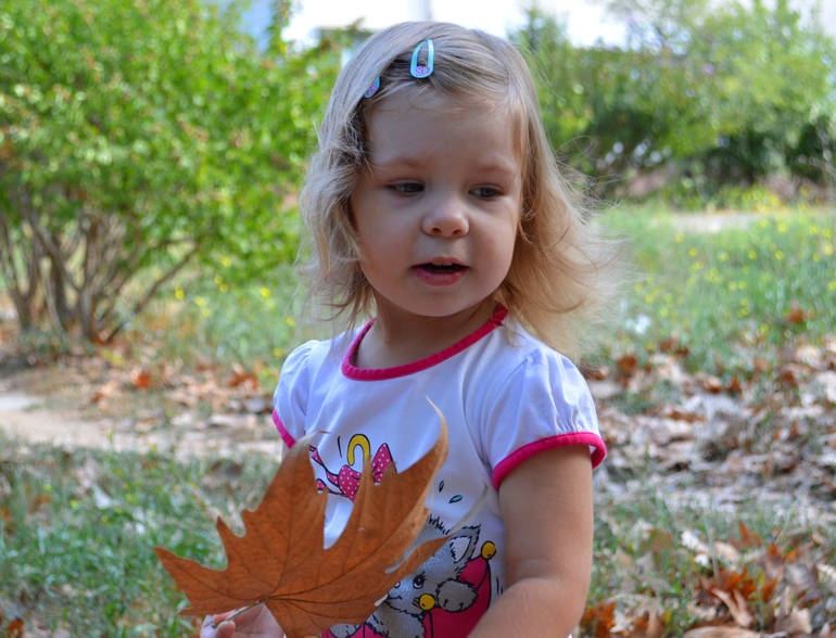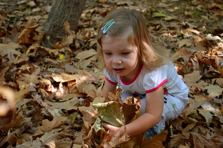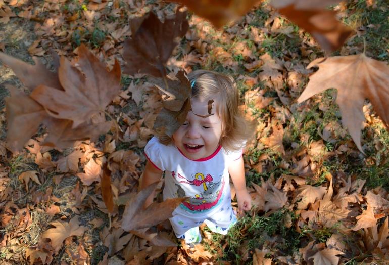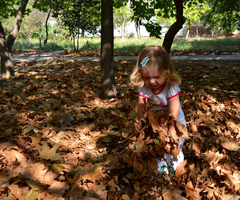 Как же умиротворяюще они шуршат! Так и манят зарыться в этот ковер или упасть и просто тихо смотреть на проплывающие в небе облака. Но это конечно меня манит))) А Катюшу шуршащие листики манят побросать, побеситься и покувыркаться в них)))