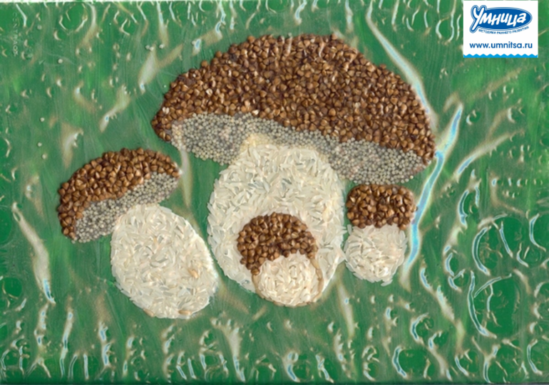 Рисуем контур грибочков, а малышу предлагаем заклеить шляпку гречкой, а ножки грибов рисом.