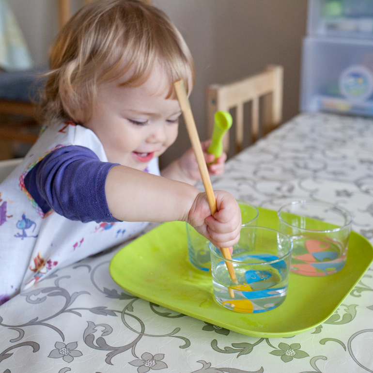 Далее слушали музыку осени. Для этого нам понадобилось несколько одинаковых стаканов, наполненных водой до разного уровня. Берем ложечку и стучим по стаканам, таким образом слышим разные звуки, а можно даже мелодию сыграть. Мы использовали разные ложки (металл,дерево). Маша не поняла, что нужно стучать, пыталась всё время попить, поэтому "играла" я, а она потом просто баловалась с переливанием))