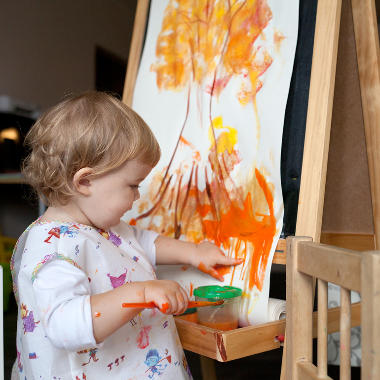 Мы рисовали осень, для этого я повесила лист бумаги на мольберт, нарисовала основу для дерева и выдала Машуне краски, кисточку и губку. Последняя ее вообще не впечатлила, она много калякала кистью, и под конец уже залезла в краску рукой. Вышло довольно масштабное дерево ))