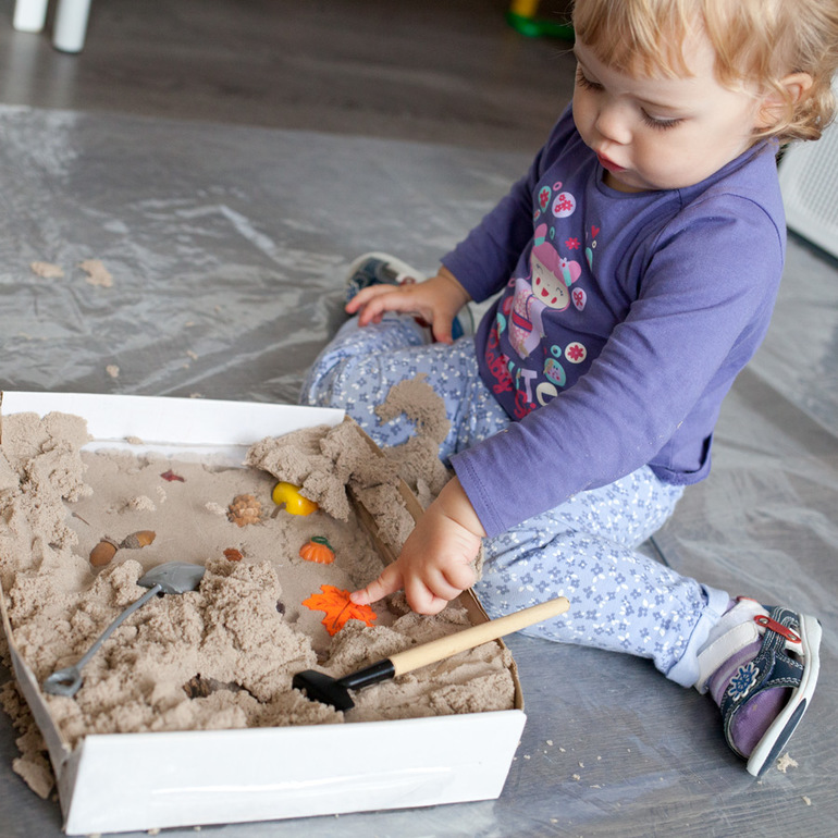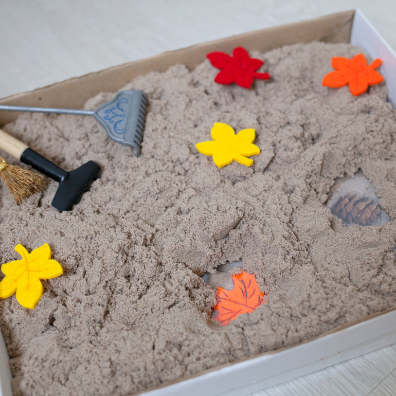 На следующий день мы искали осенние секретики. Я вспомнила из детства как мы закапывали в землю фантики, придавливали их стеклышком, а потом с трепетом и удивлением их раскапывали пальцем и смотрели что получилось) По такому же принципу была наша игра. Для этого мне понадобилась картонная коробка, в боковинах я сделала прорези. На дно коробки накидала кинетический песок ( можно любую крупу, манку и т.д.), положила осенние плоды (желуди, шишки, листочки искуств., и др), натянула пленку через прорези, зафиксировала скотчем и сверху пленки опять песок. Выдала инструмент для раскопок (а можно и без него) и все.