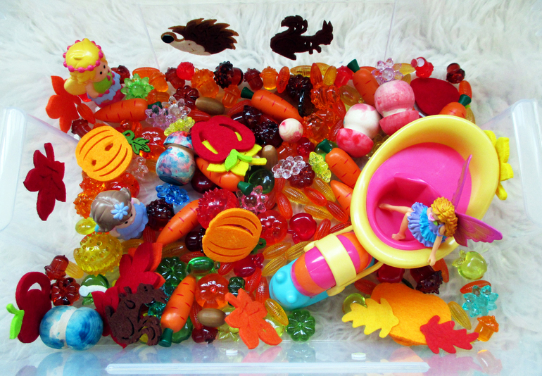 Первая сенсорная коробка скорее огородно-осенняя, там эльфы готовятся к зиме, собирают урожай и просто гуляют.