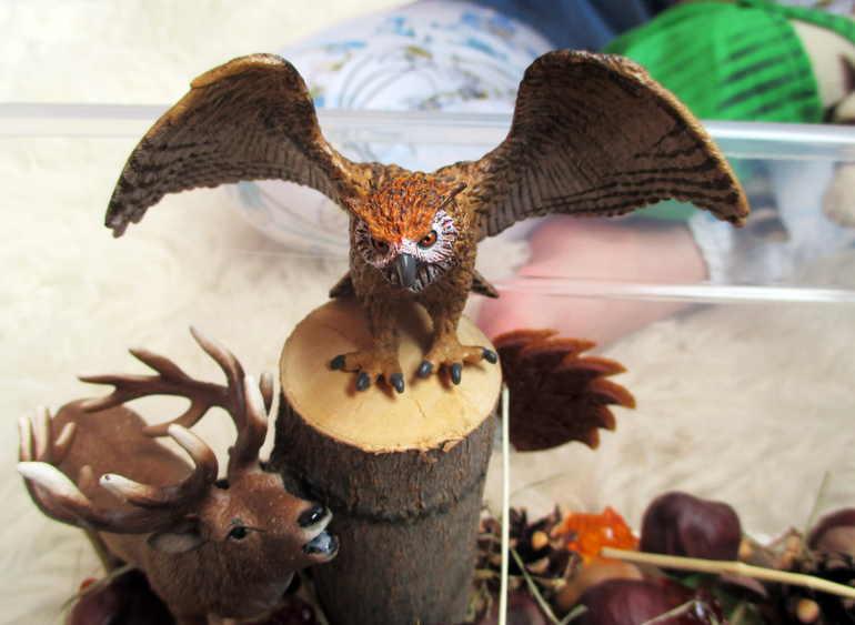 Наполнение: шишки сосновые, еловые и кедровая (лично для белки), каштаны, желуди, сено, горох, спилы ясеня, палочки деревянные и пластиковые желуди, для яркости. Животные у нас Schleich.