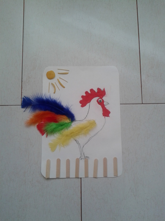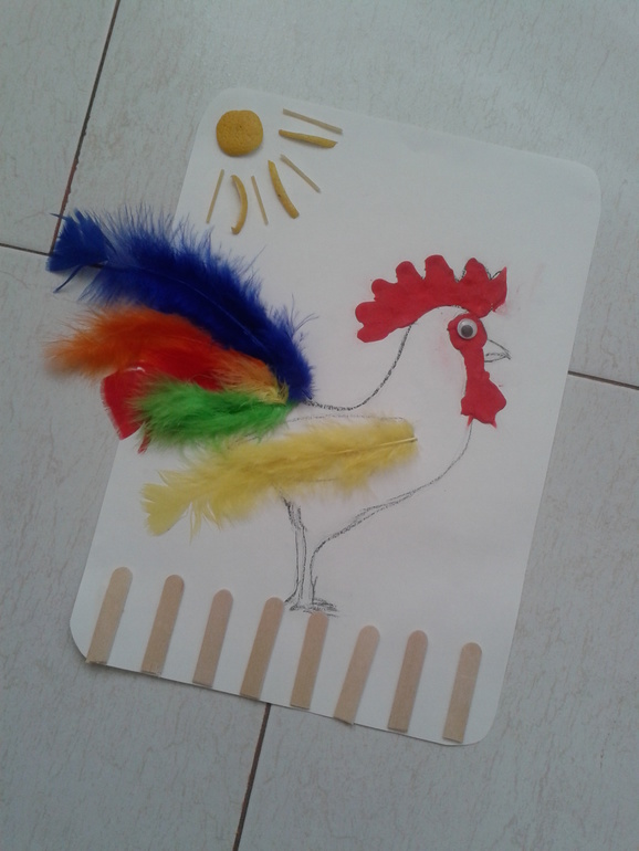 Ещё одна полезная вещь - это разучивание каждый день нового стишка. Ох! Про пользу понятно, но вот с осуществлением явно "некаждыйдень". Но сегодня звезды сложились (мама не поленилась), и вот стихотворение про петушка красавца и аппликация в тему: