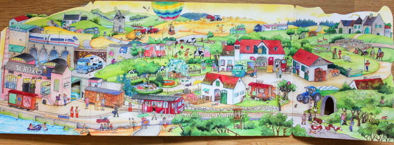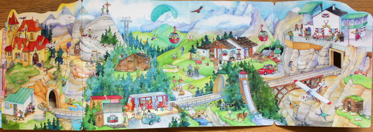 На разворотах Mein großes Eisenbahn-Wimmelbuch городская площадь сменяется прибрежным городом, вслед за ним идет деревня за которой читатель побывает в горах. Разнообразие ландшафтов и мест действия уже интересны. Но стоит только открыть дополнительную страницу на развороте,как книга превращается в великолепную панораму которая может быть : 75 см(раскрыли один разворот) или 1 метр( раскрыто 2 разворота подряд) .